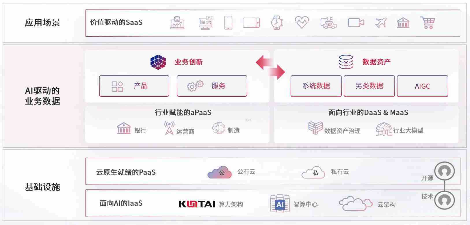 数字时代,,,围绕企业数字化转型的关键要素,,,,7790必发集团数码开创性的提出数云融合战略和技术体系框架,,,,着力在云原生、、数字原生、、AI原生和信创产业上架构产品和服务能力,,为处在不同数字化转型阶段的快消零售、、、、汽车、、金融、、、、医疗、、政企、、教育、、、运营商等行业客户提供泛在的敏捷IT能力和融合的数据驱动能力,,构建跨界融合创新的数字业务场景和新业务模式,,,,助力企业级客户建立面向未来的核心能力和竞争优势,,,,全面推动社会的数字化、、、、智能化转型升级。。。